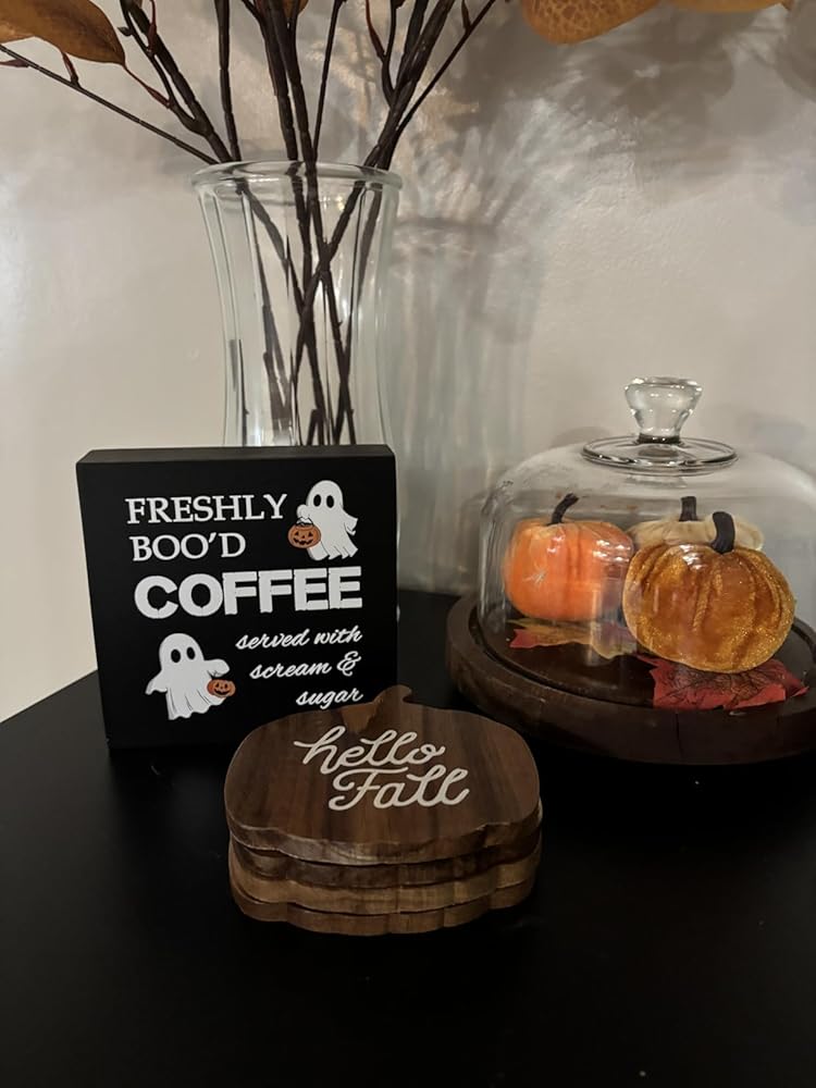 Why you’ll love it: the boxwood construction offers a warm, tactile look that pairs beautifully with coffee beans, mini pumpkins, string lights and other coffee bar wooden decorations. Use it behind the espresso station, on a bar cart, or as a focal piece for your seasonal menu display. If you’re looking to buy Halloween coffee bar decor that’s durable, stylish, and instantly Instagrammable, this rustic sign is an ideal pick.