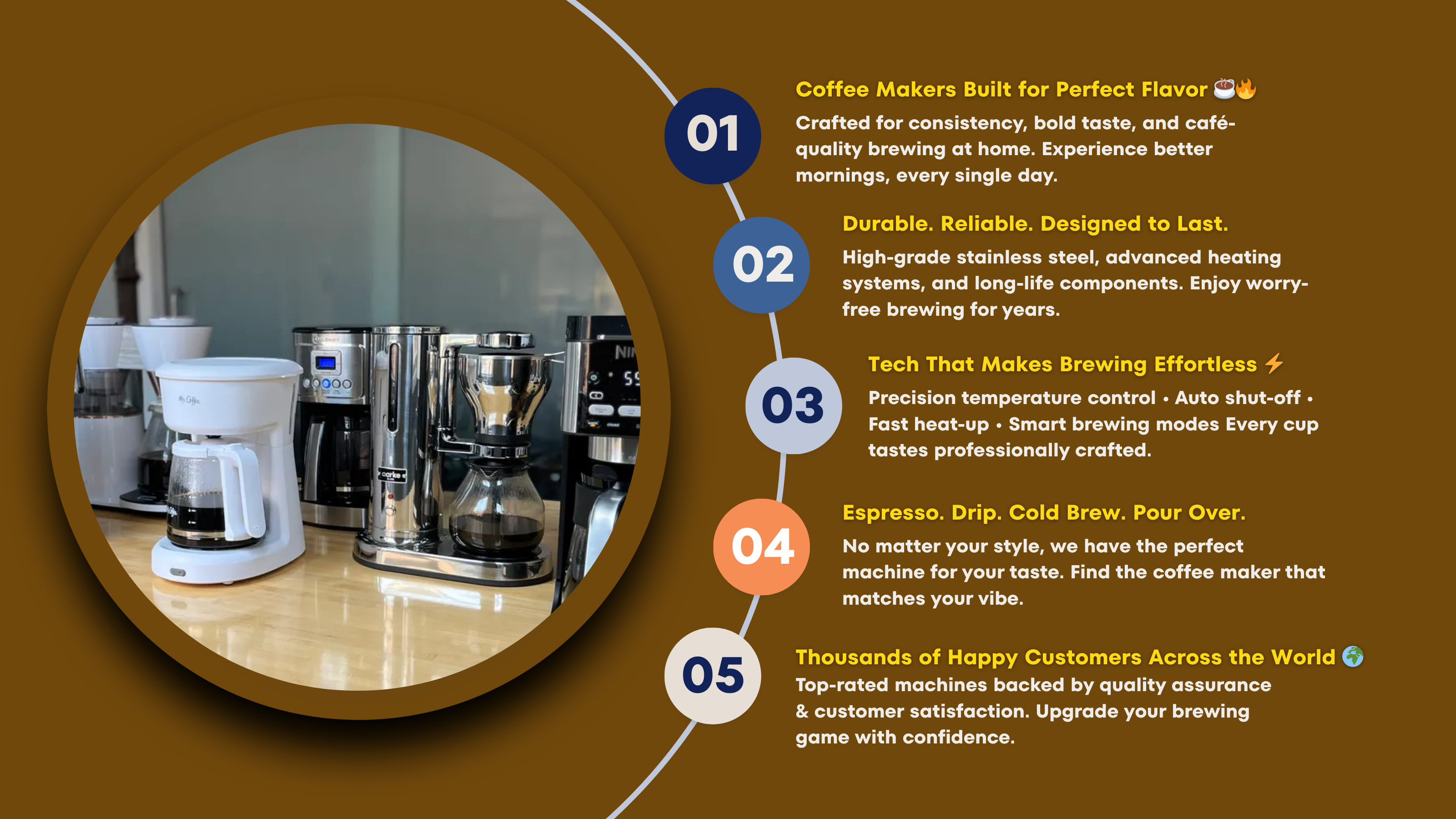 Our coffee makers are built with premium materials, advanced brewing technology, and precision temperature control to ensure café-quality flavor at home.