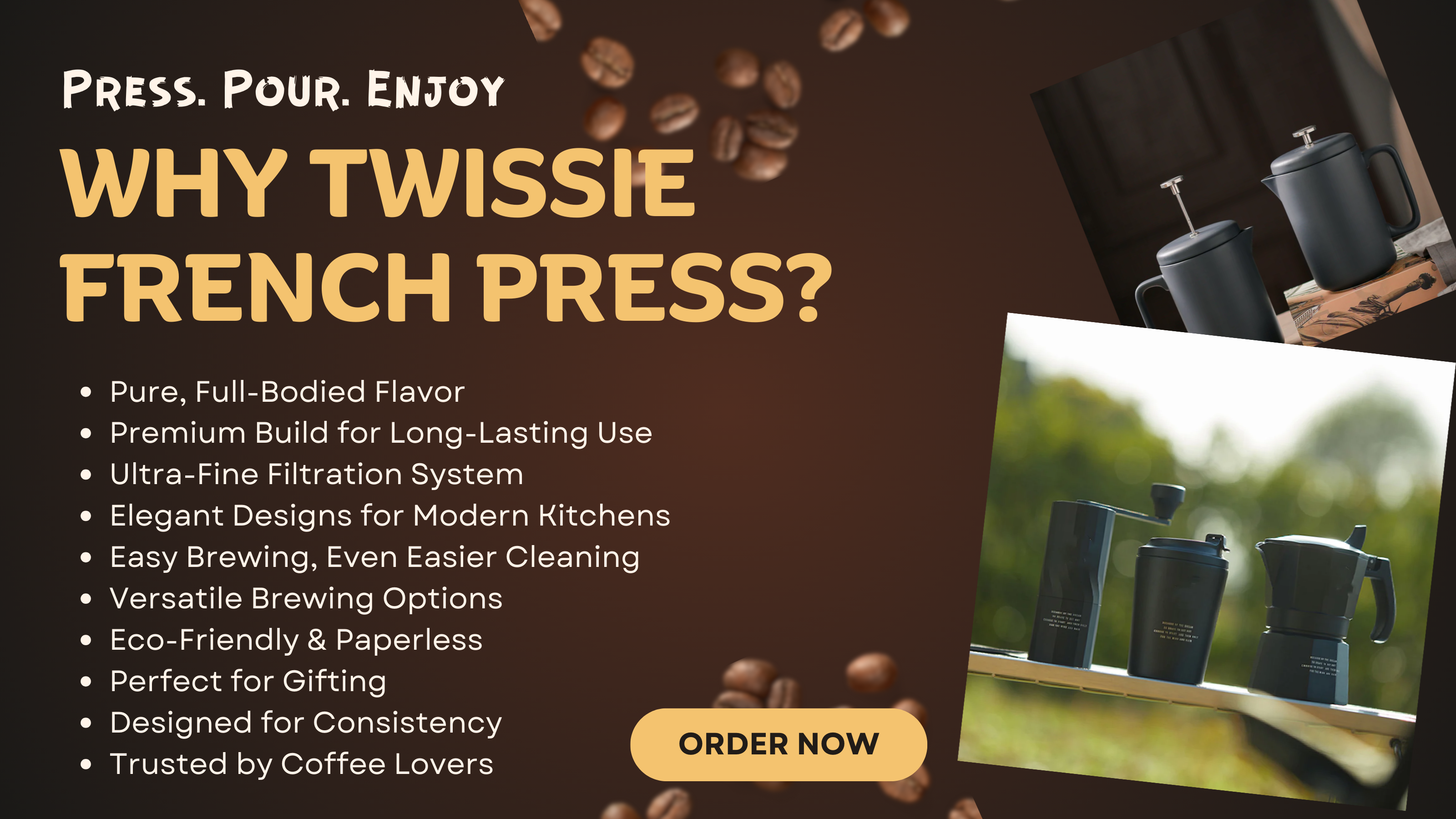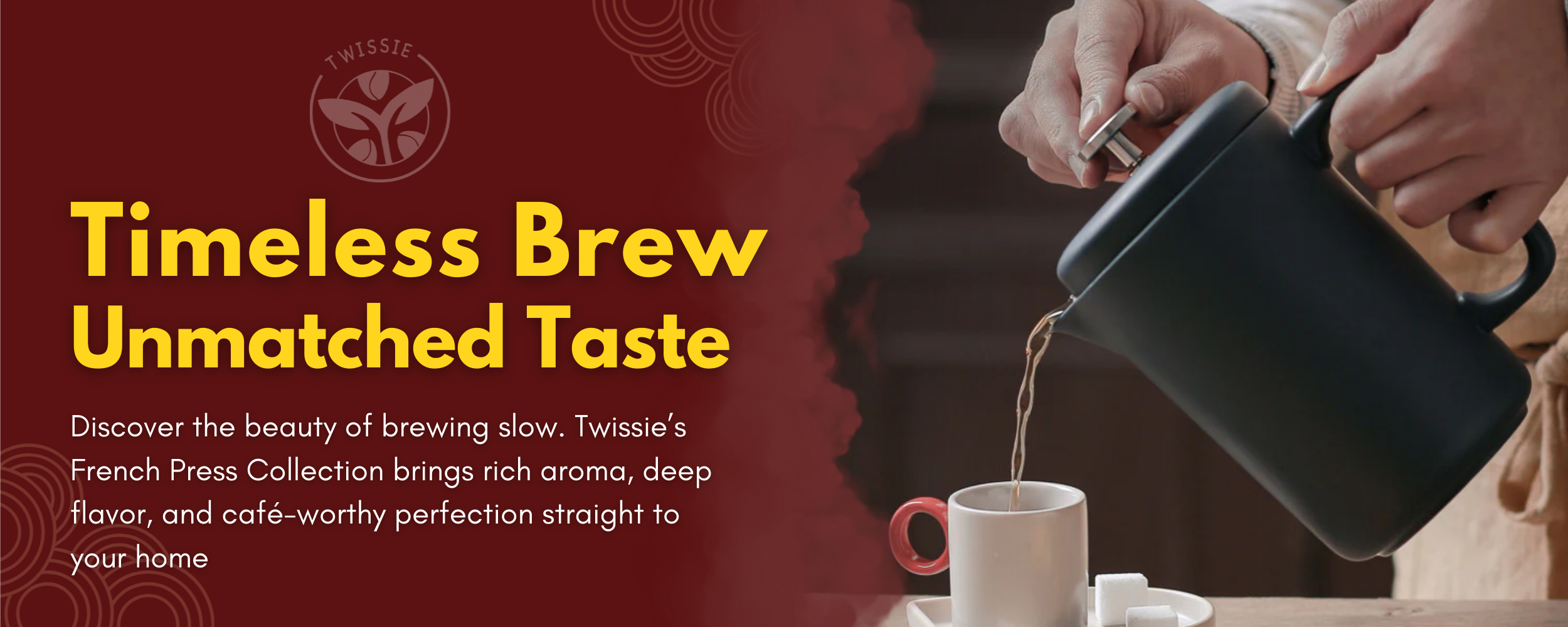 Twissie offers French Presses in multiple sizes—from single-serve 12oz to family-size 34oz—perfect for every coffee lover.