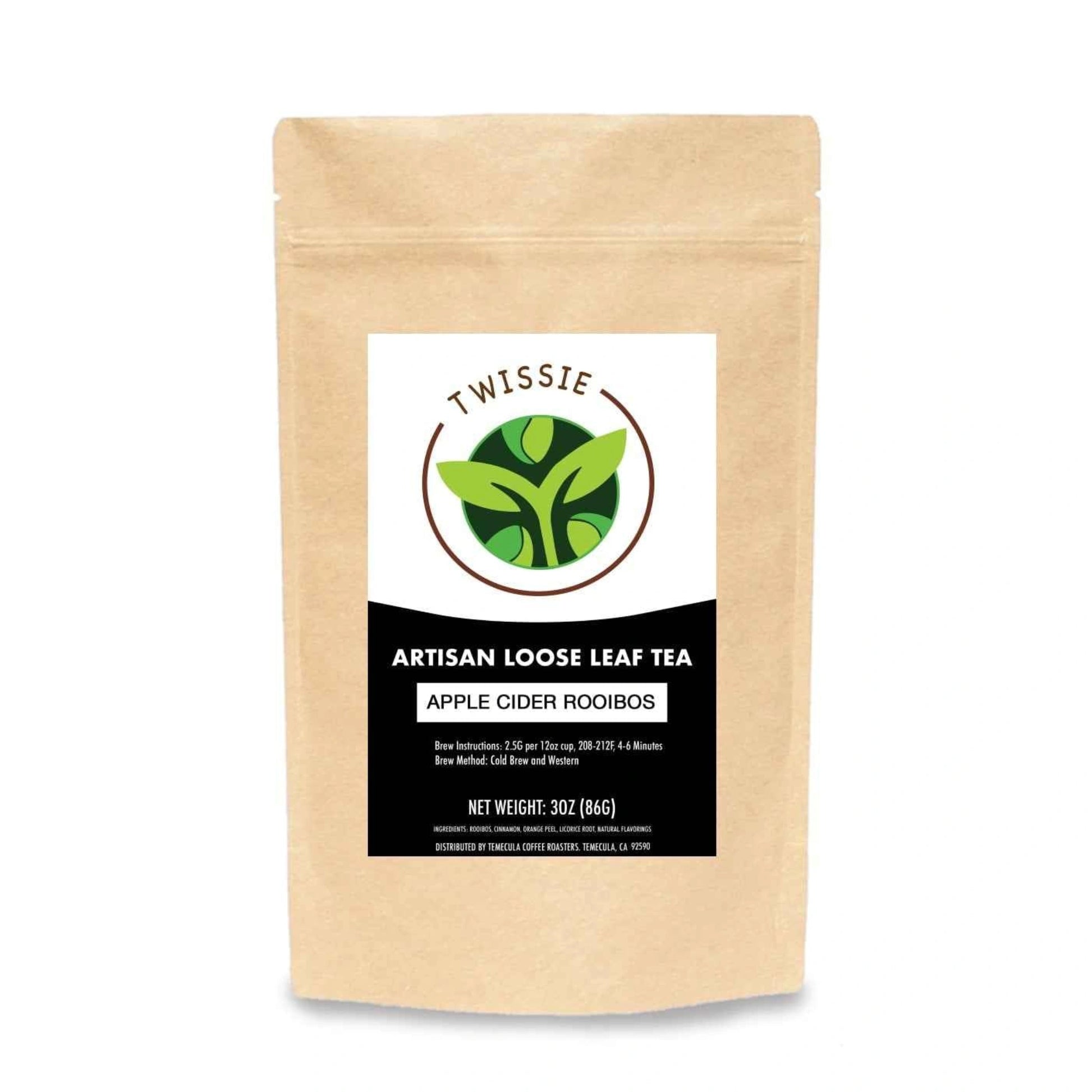 Cozy apple cider rooibos tea — spiced cinnamon, orange peel, and sweet apple notes on a naturally caffeine-free rooibos base.