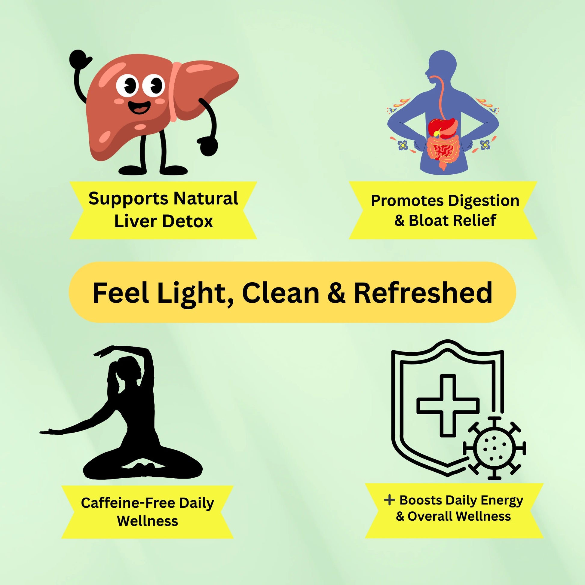Perfect for those seeking a gentle liver detox, bloat relief, and a refreshing, caffeine-free herbal tea experience.